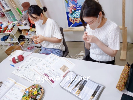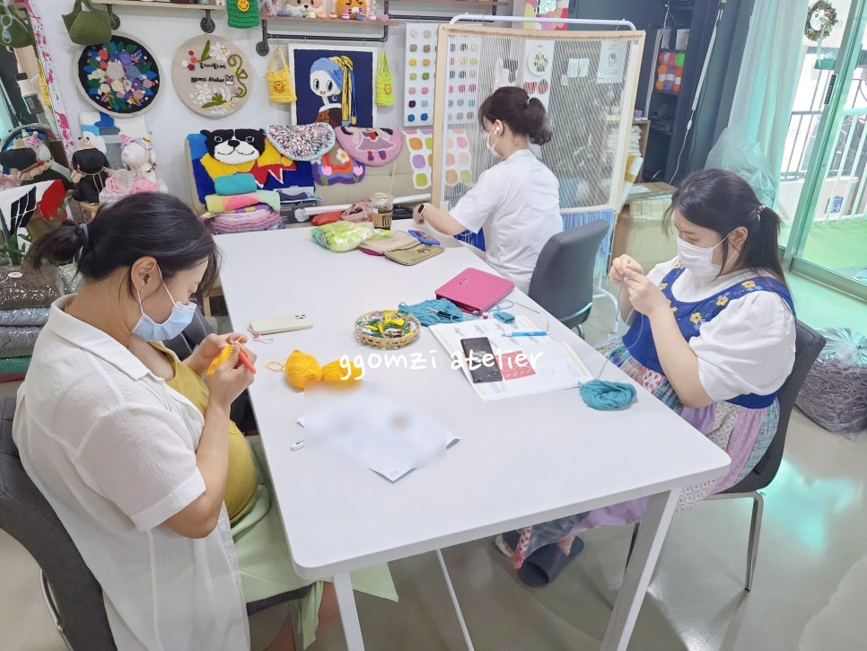 서로의 작품을 바라보며 “너무 예쁘다!” “이 색 실은 어디서 샀어요?”