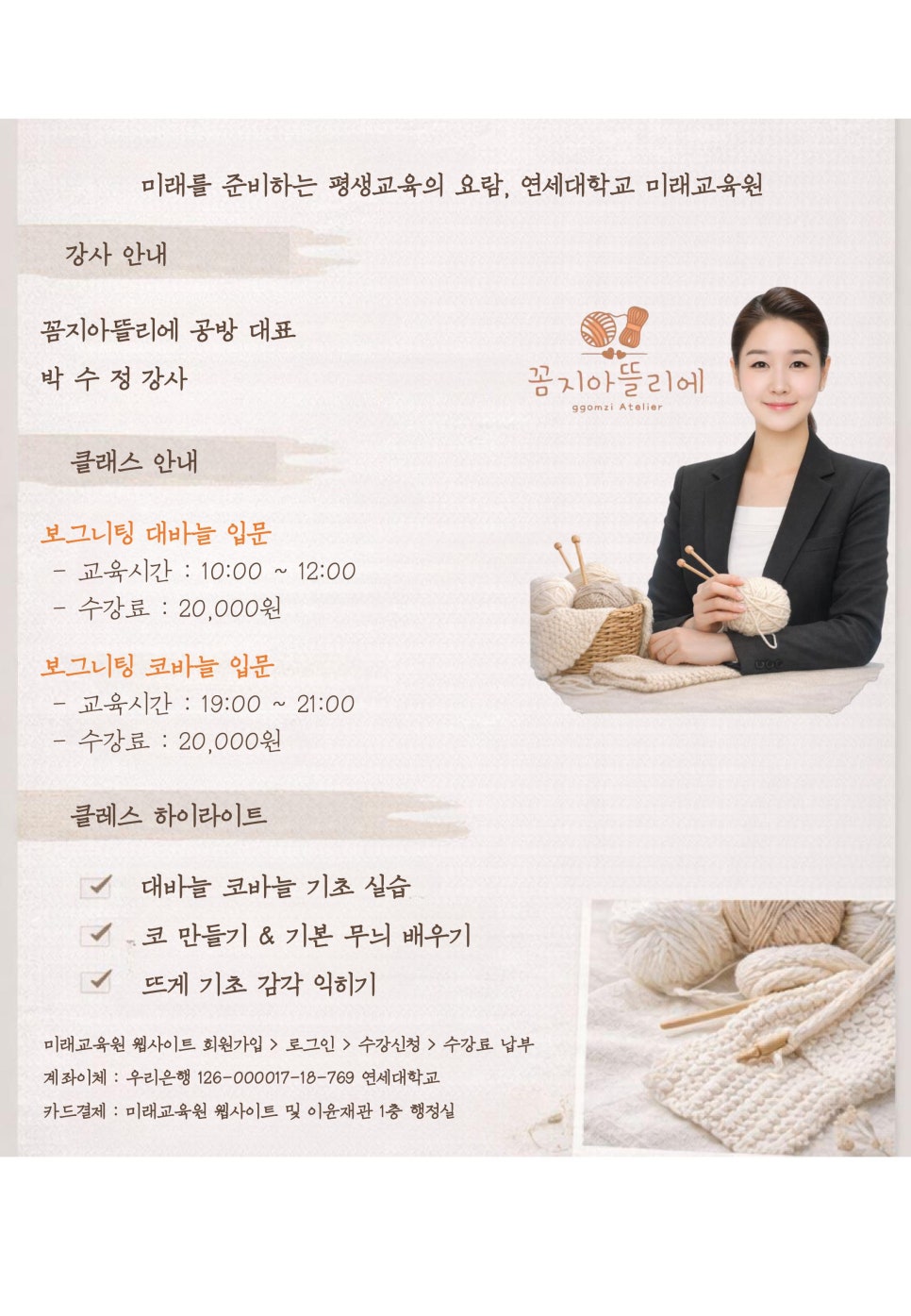 연세대학교 미래교육원에서 보그니팅(뜨개질) 강의를 맡고 있는
