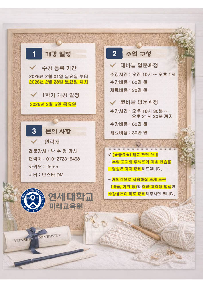 | 연세대학교 미래교육원 보그니팅 원데이클래스 안내(코바늘,대바늘) (0) | 2026.01.25 |